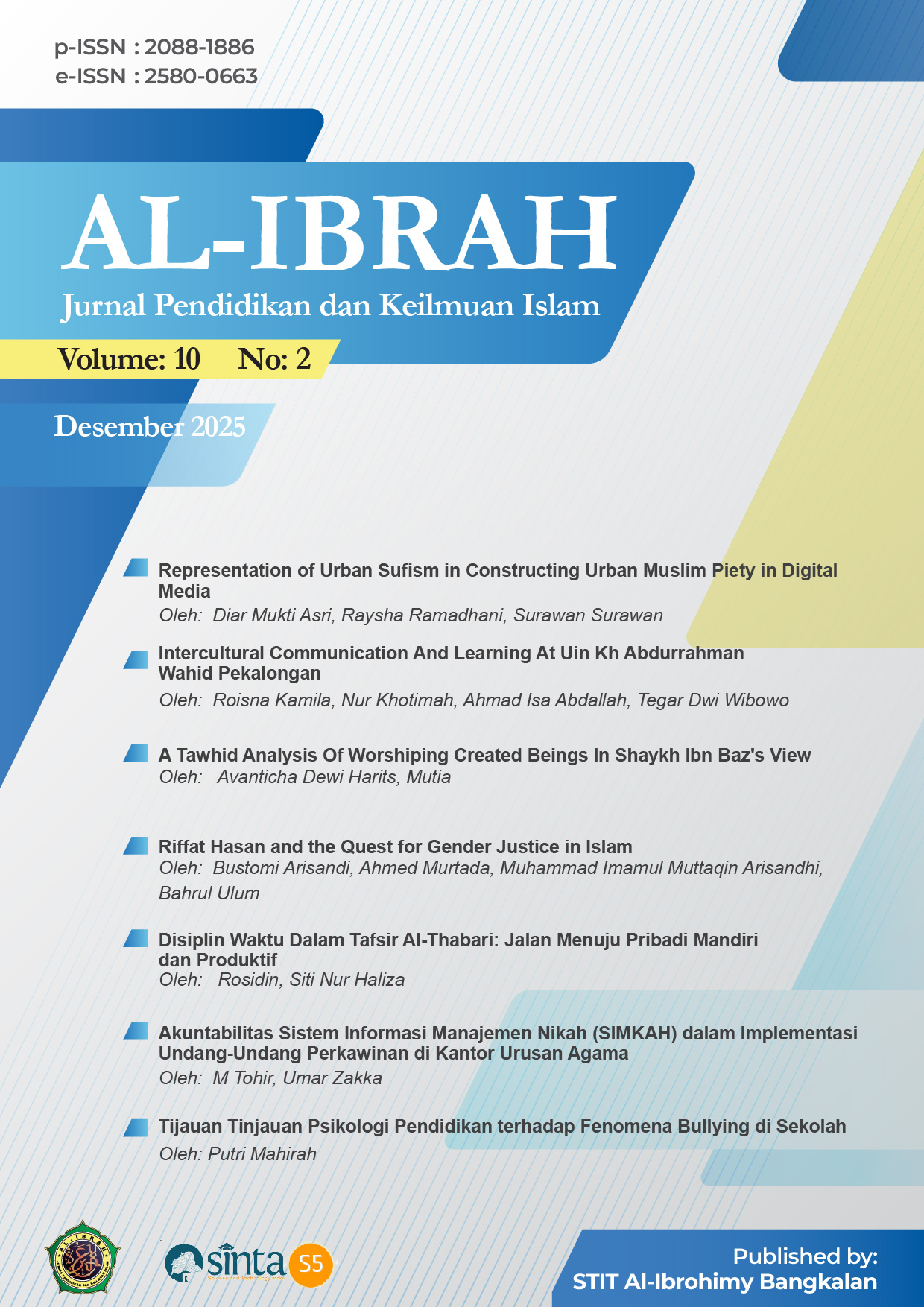 Vol. 10 No. 2 (2025)Edisi terbitan ini menyajikan sinergi menarik antara teks normatif dan konteks aktual, memperlihatkan bagaimana nilai Islam merespons tantangan zaman. Secara tematik, artikel-artikel ini bergerak dari fondasi teologis—seperti pemurnian tauhid perspektif Ibn Baz , tafsir karakter disiplin waktu Al-Thabari , dan keadilan gender Riffat Hasan —menuju aplikasi praktis di ruang publik modern. Hal ini terlihat pada kajian sufisme urban di media digital , dinamika komunikasi multikultural di kampus , serta akuntabilitas digital dalam layanan administrasi nikah (SIMKAH).